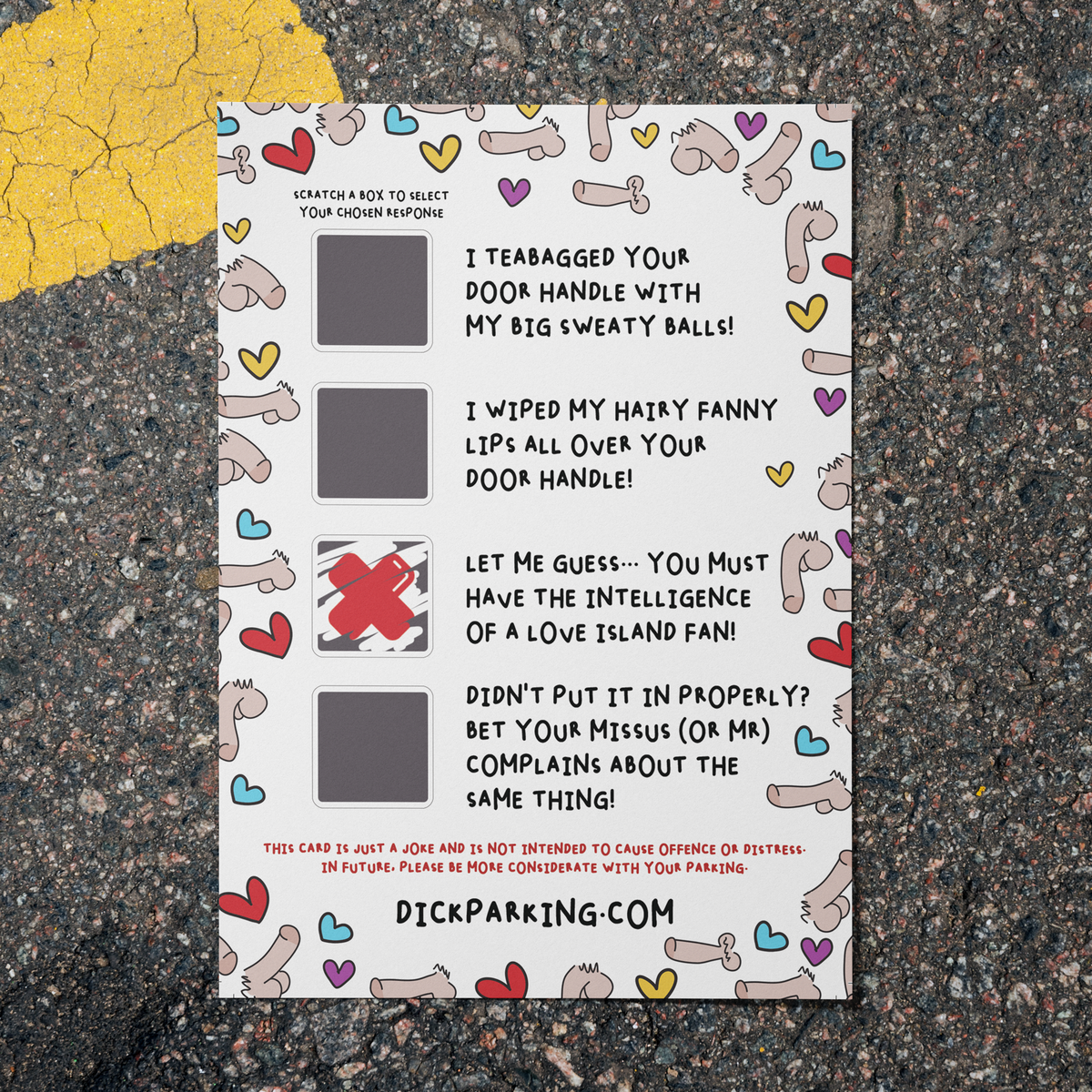 On the back of each card you’ll find four different scratch-off insults to choose from. They’re savage, rude, and downright hilarious – perfect for matching the level of parking stupidity you’ve just witnessed. From cheeky digs to jaw-dropping roasts, these responses will have you (and anyone who reads them) in stitches.